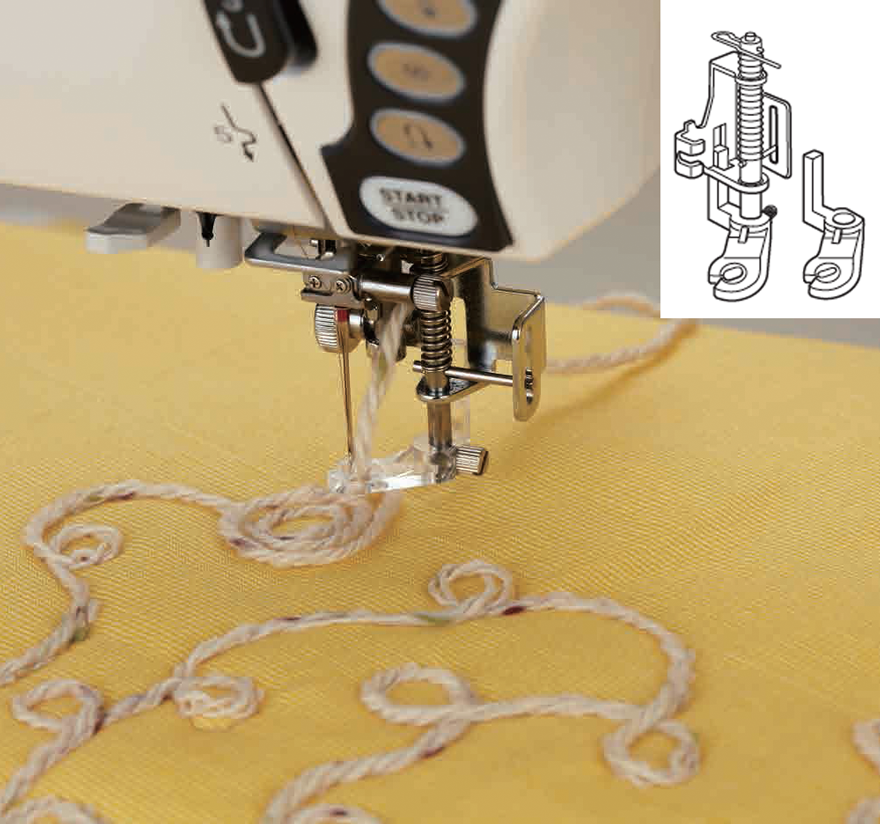 Foten fungerar precis som frihandsquiltfoten, men har en tillsats med små spår som tillåter garn och dekorativa trådar att passera under pressarfoten. Två storlekar ingår i detta set.