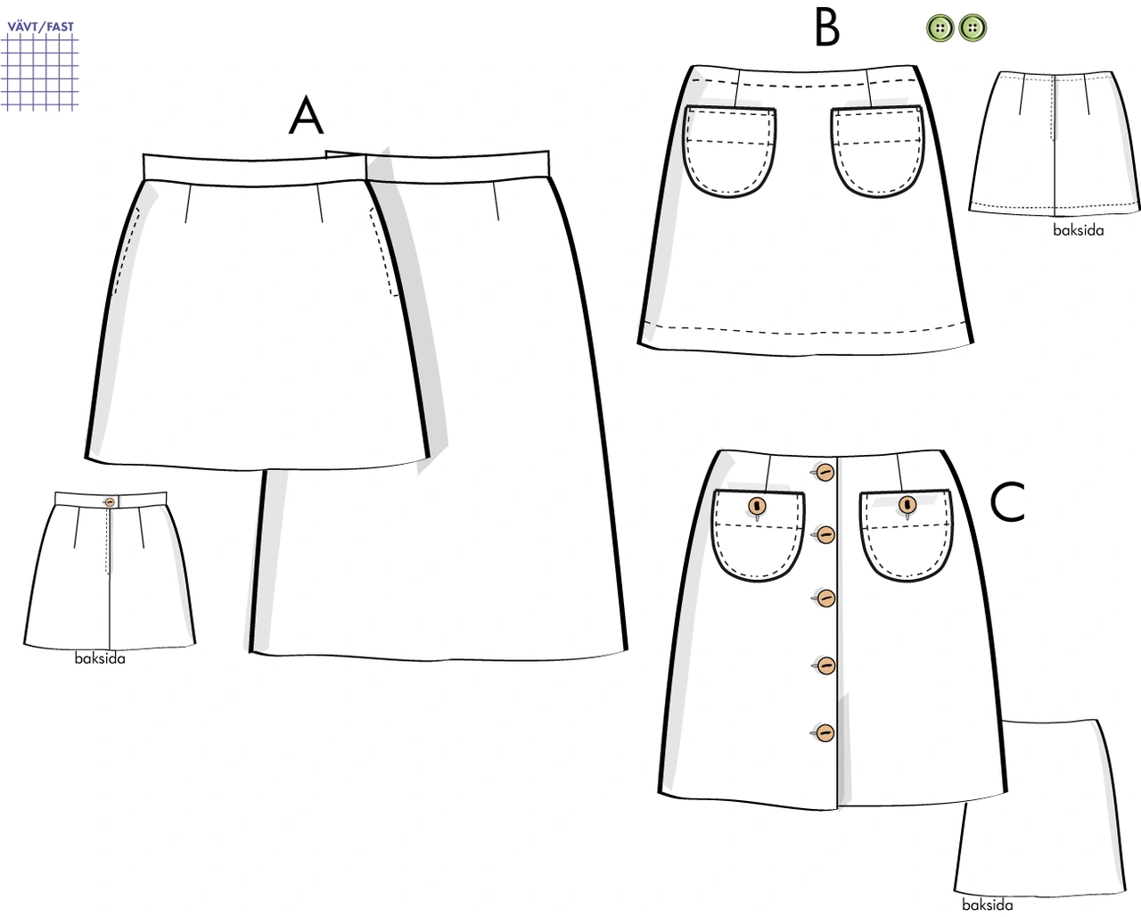 C: Kjol med infodring istället för linning i midjekanten. Knäppning mitt fram. Utanpåfickor med knapp och knapphål. Längd enligt mönstret - 50 cm.