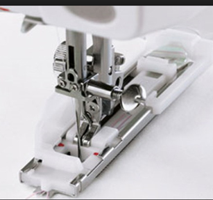 1-stegs knapphålsfoten syr automatiskt flera identiska knapphål med mått för knappen. Används även som stoppfot