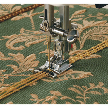 Spåren på fotens ovansida håller 1-3 snoddar på plats medan man syr fast dem med dekorsöm