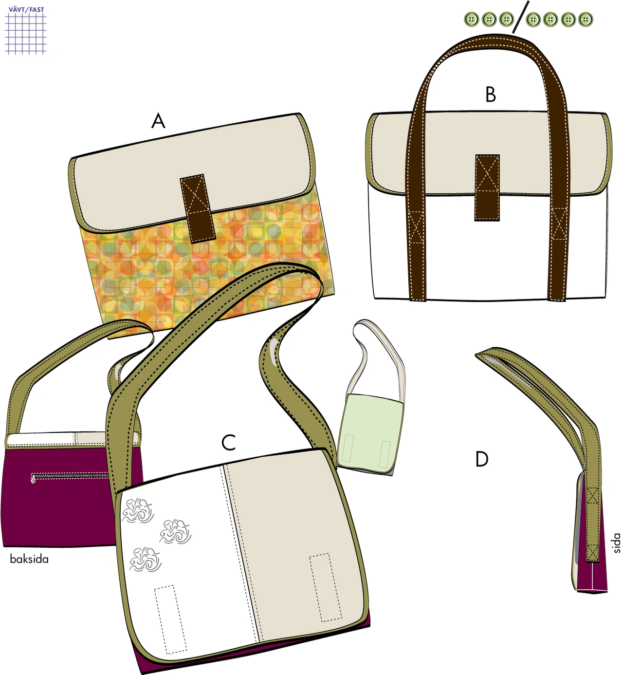 Många olika tyger kan användas, t ex vaxduk, vaxad bomullscanvas, jeanstyger, manchester, tweed och fusknappa. Stadga med Viledona, eller flera lager tunnare mellanlägg. Som stötdämpande material kan du använda grytlappsvadd eller golvfoam e. d. till A och B, se Sybehör nedan. Kombinera tyger och färger efter användningsområde och egen fantasi! Medelsvår/avancerad sömnad.